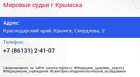 Мировые судьи г. Крымска по адресу Краснодарский край, Крымск, Свердлова, 2 в дальнейшем Организация, размещена в следующих категориях:
