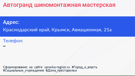 Автогранд, шиномонтажная мастерская по адресу Краснодарский край, Крымск, Авиационная, 21а в дальнейшем Организация, размещена в следующих категориях: