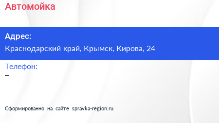 Автомойка по адресу Краснодарский край, Крымск, Кирова, 24 в дальнейшем Организация, размещена в следующих категориях: