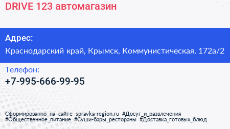 DRIVE. 123, автомагазин по адресу Краснодарский край, Крымск, Коммунистическая, 172а/2 в дальнейшем Организация, размещена в следующих категориях: