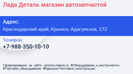 Лада Деталь, магазин автозапчастей по адресу Краснодарский край, Крымск, Адагумская, 172 в дальнейшем Организация, размещена в следующих категориях: