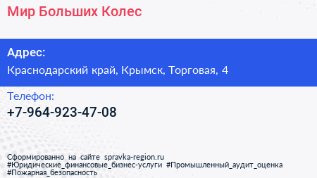 Мир Больших Колес по адресу Краснодарский край, Крымск, Торговая, 4 в дальнейшем Организация, размещена в следующих категориях: