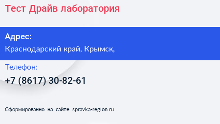 Тест-Драйв, лаборатория по адресу Краснодарский край, Крымск, в дальнейшем Организация, размещена в следующих категориях: