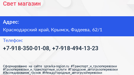 Свет, магазин по адресу Краснодарский край, Крымск, Фадеева, 62/1 в дальнейшем Организация, размещена в следующих категориях: