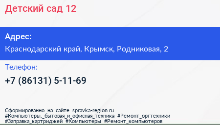 Детский сад №12 по адресу Краснодарский край, Крымск, Родниковая, 2 в дальнейшем Организация, размещена в следующих категориях: