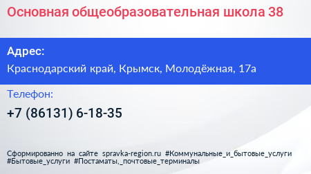Основная общеобразовательная школа №38 по адресу Краснодарский край, Крымск, Молодёжная, 17а в дальнейшем Организация, размещена в следующих категориях: