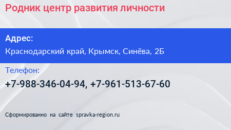Родник, центр развития личности по адресу Краснодарский край, Крымск, Синёва, 2Б в дальнейшем Организация, размещена в следующих категориях:
