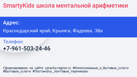 SmartyKids, школа ментальной арифметики по адресу Краснодарский край, Крымск, Фадеева, 38а в дальнейшем Организация, размещена в следующих категориях: