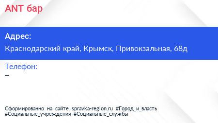 ANT, бар по адресу Краснодарский край, Крымск, Привокзальная, 68д в дальнейшем Организация, размещена в следующих категориях: