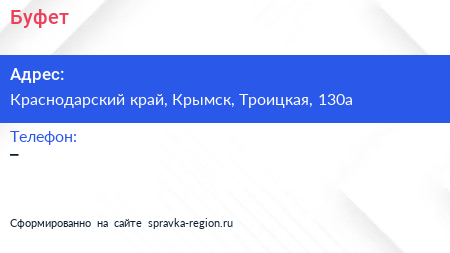 Буфет по адресу Краснодарский край, Крымск, Троицкая, 130а в дальнейшем Организация, размещена в следующих категориях:
