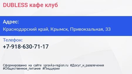 DUBLESS, кафе-клуб по адресу Краснодарский край, Крымск, Привокзальная, 33 в дальнейшем Организация, размещена в следующих категориях: