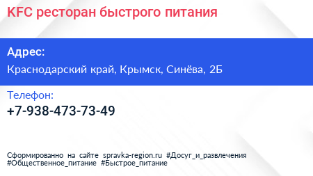 KFC, ресторан быстрого питания по адресу Краснодарский край, Крымск, Синёва, 2Б в дальнейшем Организация, размещена в следующих категориях:
