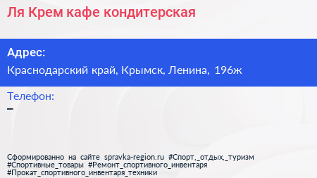 Ля Крем, кафе-кондитерская по адресу Краснодарский край, Крымск, Ленина, 196ж в дальнейшем Организация, размещена в следующих категориях: