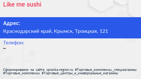 Like me sushi по адресу Краснодарский край, Крымск, Троицкая, 121 в дальнейшем Организация, размещена в следующих категориях: