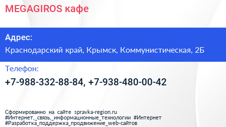 MEGAGIROS, кафе по адресу Краснодарский край, Крымск, Коммунистическая, 2Б в дальнейшем Организация, размещена в следующих категориях: