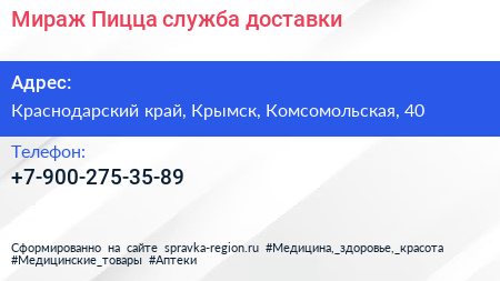 Мираж-Пицца, служба доставки по адресу Краснодарский край, Крымск, Комсомольская, 40 в дальнейшем Организация, размещена в следующих категориях: