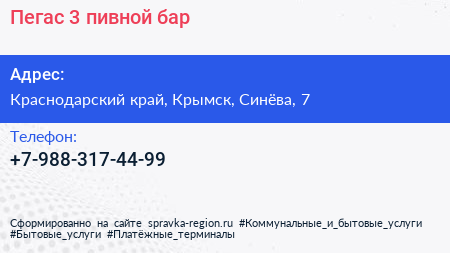 Пегас №3, пивной бар по адресу Краснодарский край, Крымск, Синёва, 7 в дальнейшем Организация, размещена в следующих категориях: