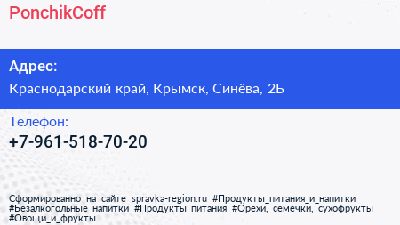 PonchikCoff по адресу Краснодарский край, Крымск, Синёва, 2Б в дальнейшем Организация, размещена в следующих категориях: