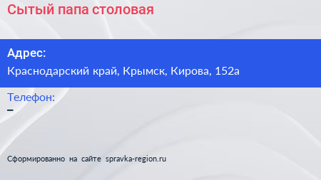 Сытый папа, столовая по адресу Краснодарский край, Крымск, Кирова, 152а в дальнейшем Организация, размещена в следующих категориях: