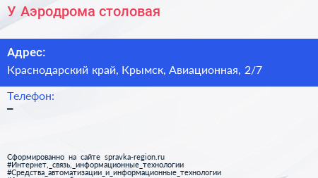 У Аэродрома, столовая по адресу Краснодарский край, Крымск, Авиационная, 2/7 в дальнейшем Организация, размещена в следующих категориях: