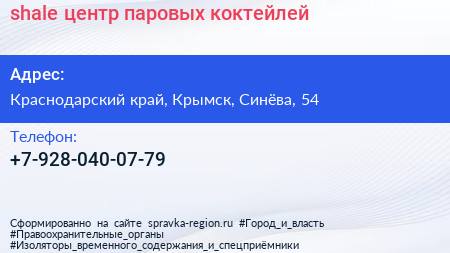 shale, центр паровых коктейлей по адресу Краснодарский край, Крымск, Синёва, 54 в дальнейшем Организация, размещена в следующих категориях: