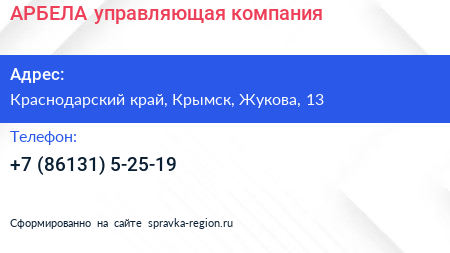 АРБЕЛА, управляющая компания по адресу Краснодарский край, Крымск, Жукова, 13 в дальнейшем Организация, размещена в следующих категориях: