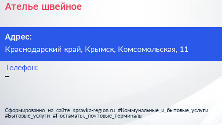 Ателье швейное по адресу Краснодарский край, Крымск, Комсомольская, 11 в дальнейшем Организация, размещена в следующих категориях: