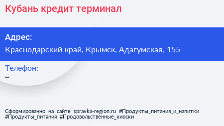 Кубань кредит, терминал по адресу Краснодарский край, Крымск, Адагумская, 155 в дальнейшем Организация, размещена в следующих категориях: