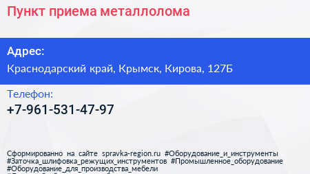 Пункт приема металлолома по адресу Краснодарский край, Крымск, Кирова, 127Б в дальнейшем Организация, размещена в следующих категориях: