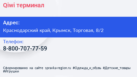 Qiwi, терминал по адресу Краснодарский край, Крымск, Торговая, 8/2 в дальнейшем Организация, размещена в следующих категориях: