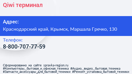 Qiwi, терминал по адресу Краснодарский край, Крымск, Маршала Гречко, 130 в дальнейшем Организация, размещена в следующих категориях: