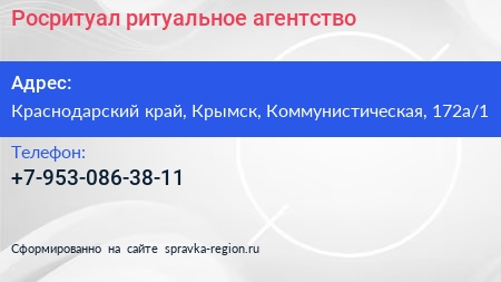 Росритуал, ритуальное агентство по адресу Краснодарский край, Крымск, Коммунистическая, 172а/1 в дальнейшем Организация, размещена в следующих категориях: