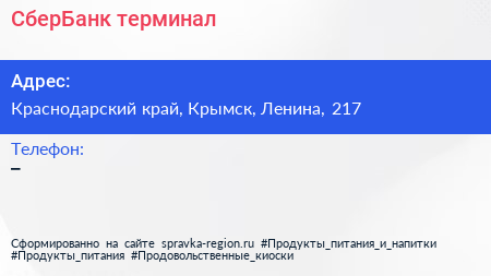 СберБанк, терминал по адресу Краснодарский край, Крымск, Ленина, 217 в дальнейшем Организация, размещена в следующих категориях:
