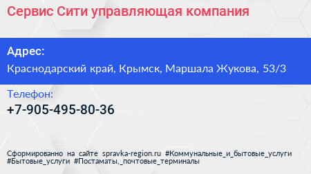 Сервис-Сити, управляющая компания по адресу Краснодарский край, Крымск, Маршала Жукова, 53/3 в дальнейшем Организация, размещена в следующих категориях: