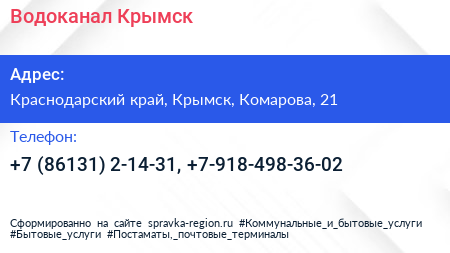 Водоканал Крымск по адресу Краснодарский край, Крымск, Комарова, 21 в дальнейшем Организация, размещена в следующих категориях: