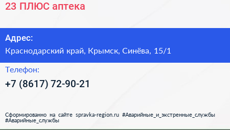 23 ПЛЮС, аптека по адресу Краснодарский край, Крымск, Синёва, 15/1 в дальнейшем Организация, размещена в следующих категориях: