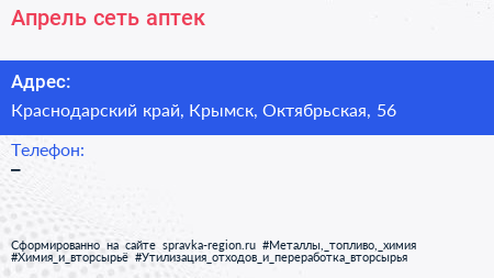 Апрель, сеть аптек по адресу Краснодарский край, Крымск, Октябрьская, 56 в дальнейшем Организация, размещена в следующих категориях: