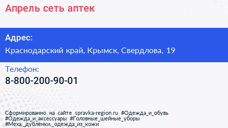 Апрель, сеть аптек по адресу Краснодарский край, Крымск, Свердлова, 19 в дальнейшем Организация, размещена в следующих категориях: