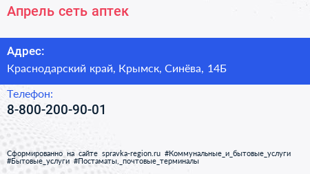 Апрель, сеть аптек по адресу Краснодарский край, Крымск, Синёва, 14Б в дальнейшем Организация, размещена в следующих категориях: