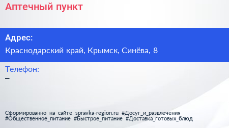 Аптечный пункт по адресу Краснодарский край, Крымск, Синёва, 8 в дальнейшем Организация, размещена в следующих категориях: