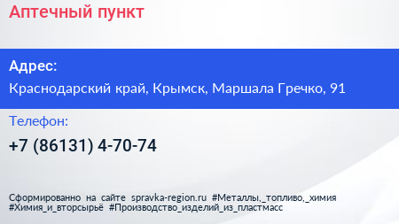 Аптечный пункт по адресу Краснодарский край, Крымск, Маршала Гречко, 91 в дальнейшем Организация, размещена в следующих категориях:
