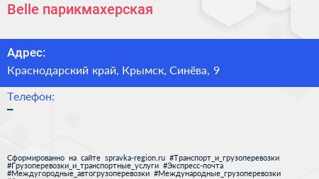Belle, парикмахерская по адресу Краснодарский край, Крымск, Синёва, 9 в дальнейшем Организация, размещена в следующих категориях: