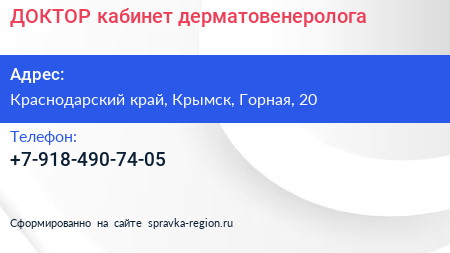 ДОКТОР, кабинет дерматовенеролога по адресу Краснодарский край, Крымск, Горная, 20 в дальнейшем Организация, размещена в следующих категориях: