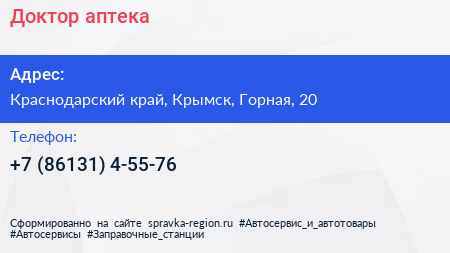 Доктор, аптека по адресу Краснодарский край, Крымск, Горная, 20 в дальнейшем Организация, размещена в следующих категориях: