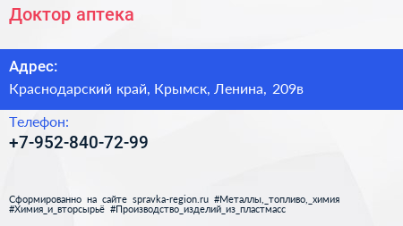 Доктор, аптека по адресу Краснодарский край, Крымск, Ленина, 209в в дальнейшем Организация, размещена в следующих категориях:
