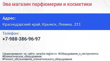Эва, магазин парфюмерии и косметики по адресу Краснодарский край, Крымск, Ленина, 211 в дальнейшем Организация, размещена в следующих категориях: