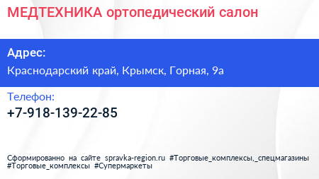 МЕДТЕХНИКА, ортопедический салон по адресу Краснодарский край, Крымск, Горная, 9а в дальнейшем Организация, размещена в следующих категориях: