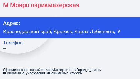 М.Монро, парикмахерская по адресу Краснодарский край, Крымск, Карла Либкнехта, 9 в дальнейшем Организация, размещена в следующих категориях:
