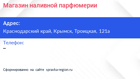 Магазин наливной парфюмерии по адресу Краснодарский край, Крымск, Троицкая, 121а в дальнейшем Организация, размещена в следующих категориях: