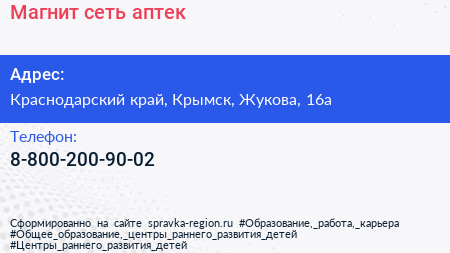 Магнит, сеть аптек по адресу Краснодарский край, Крымск, Жукова, 16а в дальнейшем Организация, размещена в следующих категориях: